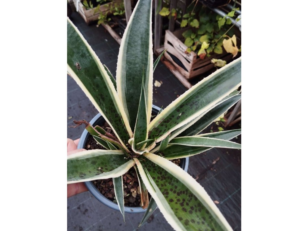 Mangave ‘Snow Leopard’ je fascinující hybridní sukulent, který kombinuje nejlepší vlastnosti rodů Agave a Manfreda. Tato rostlina je zvláště známá svým ohromujícím pestrým listím, které se vyznačuje směsí krémově bílé a zelené pruhy, jež připomínají vzory srsti sněžného leoparda. Listy jsou dlouhé, štíhlé a elegantně se ohýbají z centrální růžice, čímž vytvářejí elegantní a symetrický tvar. Unikátní zbarvení a tvar Mangave ‘Snow Leopard’ z něj činí vynikající přírůstek do jakékoli zahrady nebo květináče.