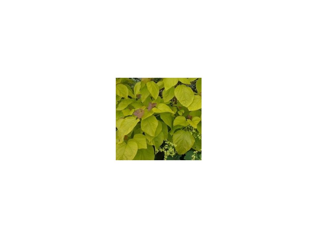 Catalpa bignonioides ´Aurea´, sazenice cca 50-6 cm vysoká v K5Kultivar Aurea nese velmi velké (20-25 cm), až tropicky vyhlížející listy žlutozelené barvy a srdčitého tvaru. Jsou poseté jemnými chloupky a na dotek příjemně semišově měkké. Vydávají zvláštní, tabáku podobnou vůni, jež údajně odpuzuje komáry. Na začátku léta vykvétá množstvím trubkovitých/zvonkovitých květů, doširoka rozevřených, bílé barvy s vínovým tečkováním a žluto-oranžovým hrdlem. Jsou uspořádány ve vzpřímených latách, 20-30 cm vysokých. Semena se tvoří v extrémně dlouhých, tmavě hnědých luscích, které zdobí strom i po opadání listů až do jara.